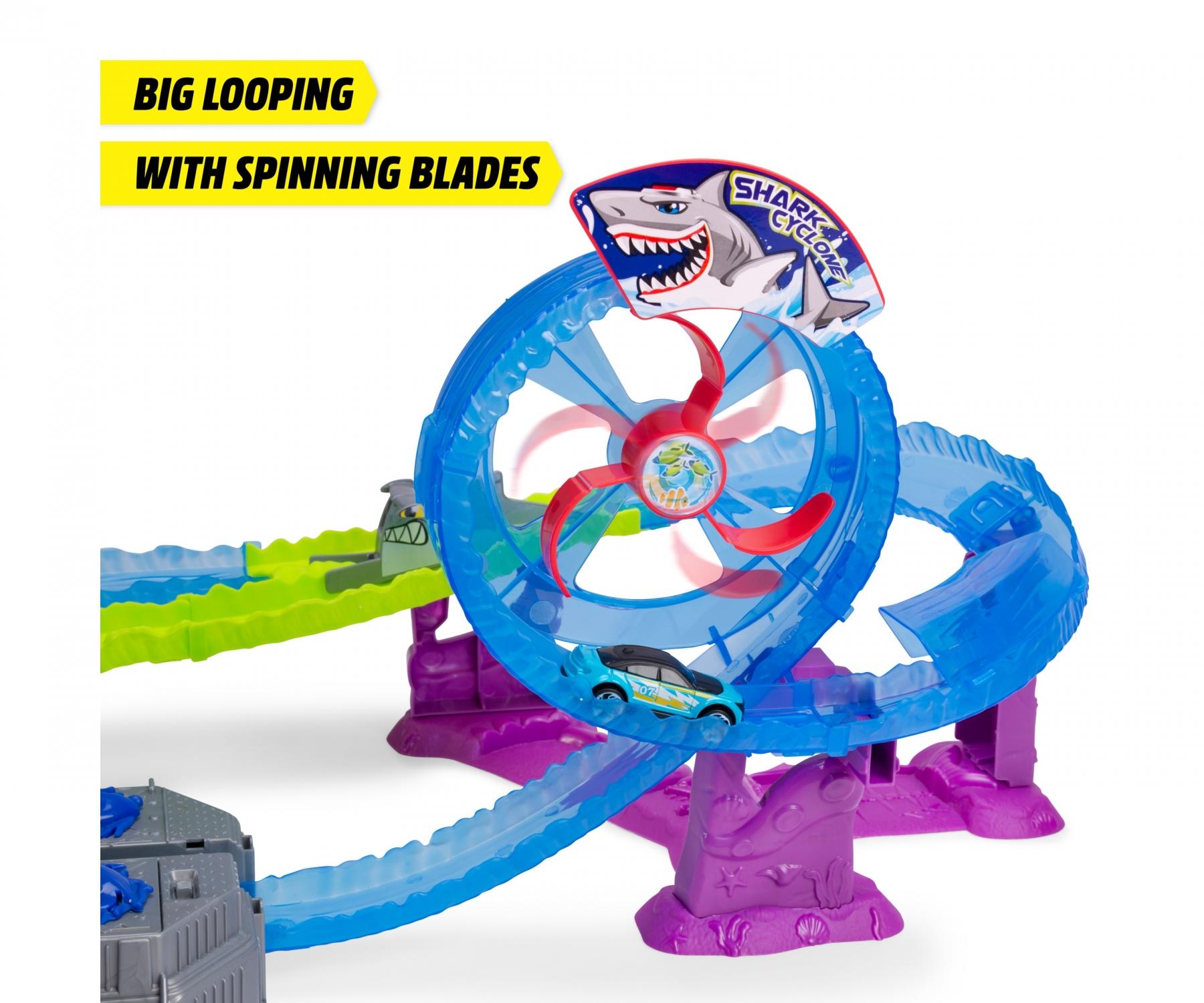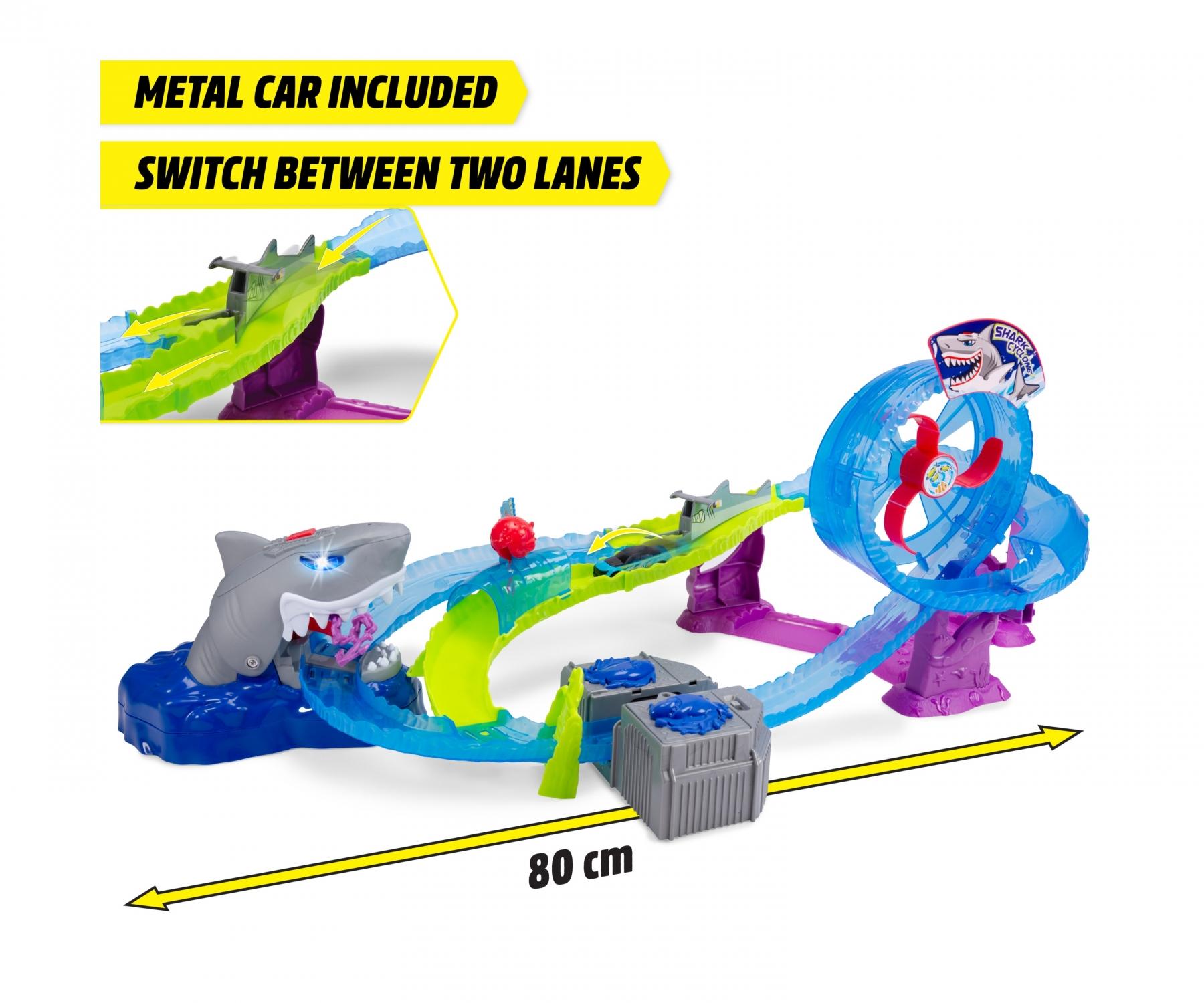 Der motorisierte Turbobooster schickt das Auto mit voller Geschwindigkeit los, während Licht- und Soundeffekte das dramatische Erlebnis verstärken. Die Strecke wechselt automatisch zwischen verschiedenen Fahrwegen – wird das Auto dem Hai entkommen oder in seinen Fängen stecken bleiben? Aufregung ist an jeder Ecke garantiert!