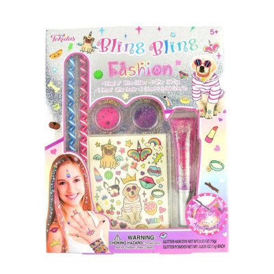 The set includes everything needed to make the hairstyle magically glittery: a tube of glittery hair dye, two jars of fine glitter powder and two colorful curly hair extensions that attach to the hair for an extra wow effect. The included sheet of tattoo stickers allows you to complete the look with stylish temporary tattoos to match the glittery style.