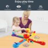 The basket is turned up manually so no batteries are needed. The game includes a base plus basketball hoop, four arms to which the balls roll with a small hand that shoots the ball, balls in four colors (six balls in each color), and cards and stickers.