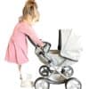 This is the perfect doll stroller for your favorite doll. The doll’s pram has a fold-down cover and plenty of storage space for the doll’s things under the pram and in the accompanying bag. With this realistic doll carriage, little kids can play mommy and daddy.