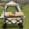 De opvouwbare kampeerwagen met tafel is een veelzijdige en duurzame aanhanger met een bijbehorende tafel. Perfect voor kamperen, uitstapjes of het strand.
