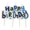 Deze mooie taartkaars heeft vier stokjes en een grote tekst met “HAPPY BIRTHDAY”. De tekst is geschreven in blauwe kleur met details in zwart en groen. Ook verkrijgbaar in andere kleuren. Past goed bij het blauwe thema.