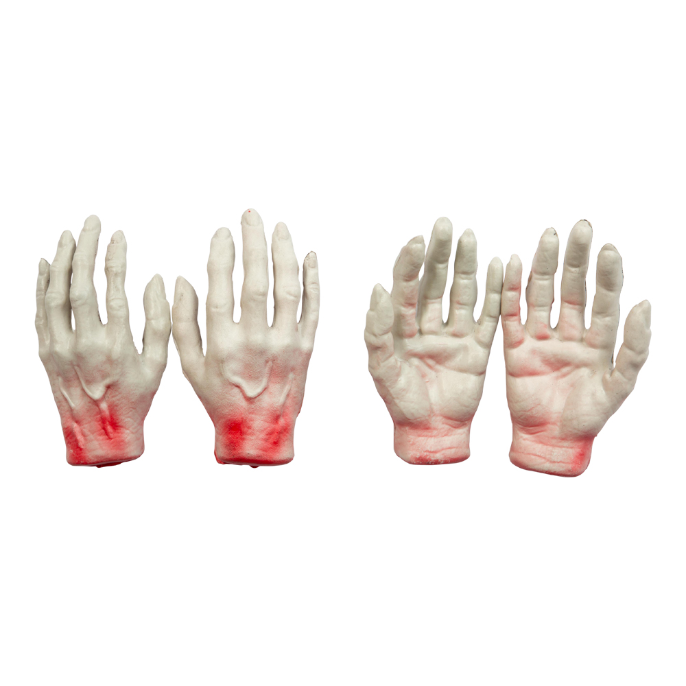 Varje nätpåse innehåller fyra avhuggna händer tillverkade i PE-material, vilket gör dem lätta att placera och arrangera precis där du vill ha en extra ryslig effekt. Kombinera gärna med spindelnät, skelett och andra dekorationer för att bygga upp en ännu mer skrämmande Halloween-miljö.
