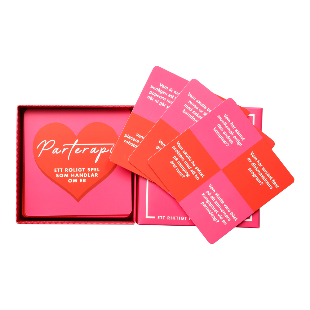 Spel Parterapi är även ett miljövänligt val – det är FSC-certifierat, Svanenmärkt, klimatkompenserat, och ett träd planteras för varje sålt spel. Perfekt för par som vill ha kul tillsammans, stärka relationen och skapa minnesvärda stunder.